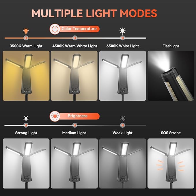 - γ5 π³πππππππ π΄ππ ππ & 3 π©πππππππππ π³πππππγ: AKOFUN rechargeable LED work light with stand offers five lighting modes: white light (6500K), warm light (3500K), warm white light (4500K), spotlight (8300K), and SOS strobe light. Each of the first four modes includes three brightness levels. Completely customization satisfy needs for variable working conditions With a MEMORY FUNCTION, it restores the LAST USED LIGHTING SETTING when restarted, ensuring SEAMLESS USE.