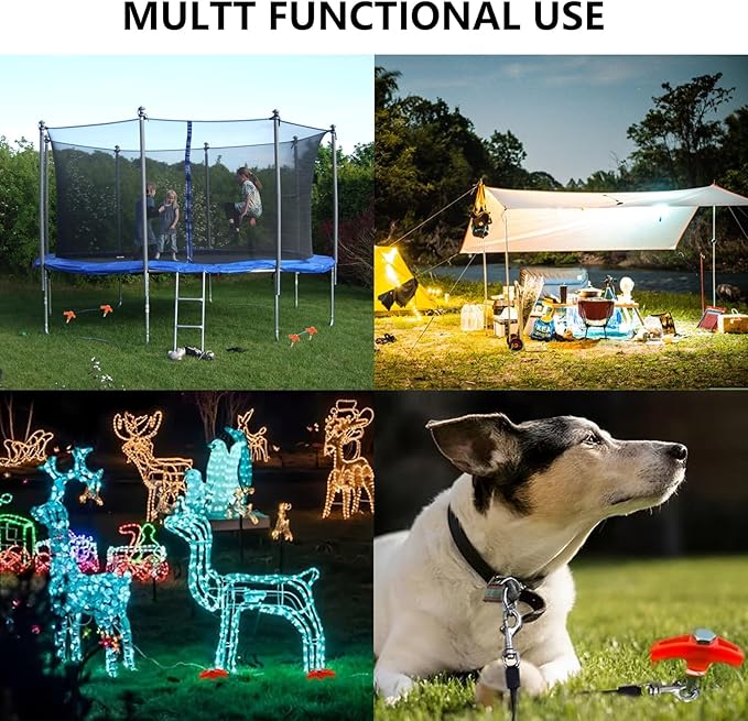 - 【Versatile Multi-Purpose】 The inflatable decoration stakes can not only be used to fix ordinary camping tents but also canopies, tarps, picnic mats, or even secure dog leashes. They are quite useful camping travel tools. These stakes for inflatables can be used for various occasions as well, such as garden lights, Thanksgiving, Halloween pumpkin lights and streetlights, Christmas Santa Claus and snowmen.