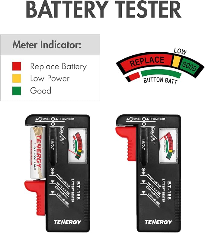 - Includes battery tester for alkaline/nimh/nicd batteries, use to determine how much power each battery still holds after long periods of storage.