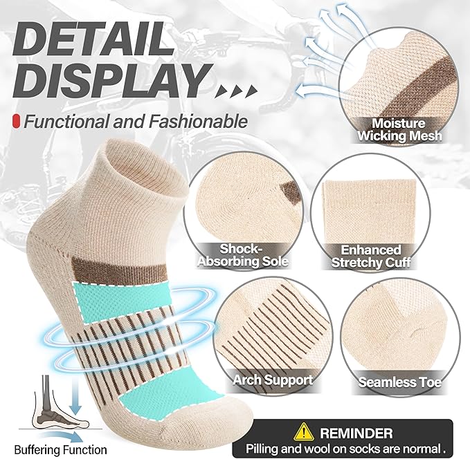 6 Pairs Merino Wool Ankle Running Hiking Socks Compression Support Breathable Thick Cushion No Show Socks for Women Men