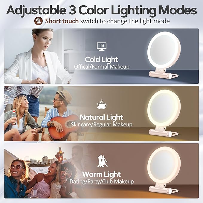 - 【 Adjustable Stand & 3 Colors】Features a flexible foldaway handle. The desk mirror with light can be hung on the wall or stand on any flat surface by adjusting the handle, and can be used as a hand mirror, tabletop mirror, and hanging mirror. 3 kinds of lights: warm light, white light, daylight, and bright light without glare, can protect your eyes. You can choose different light colors according to your needs