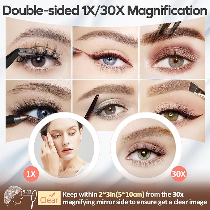 - 【1X/30X Double Sided Mirror】This vanity mirror with lights has a 1x HD flat mirror on one side and a superb 30x magnification on the other side, while the 30x magnification helps with a variety of delicate make-up manipulations, such as wearing contact lenses, trimming eyebrows, applying mascara and more. classic 2-sided design makes it easier to get a flawless makeup look with this magnifying mirror