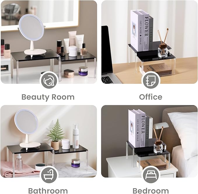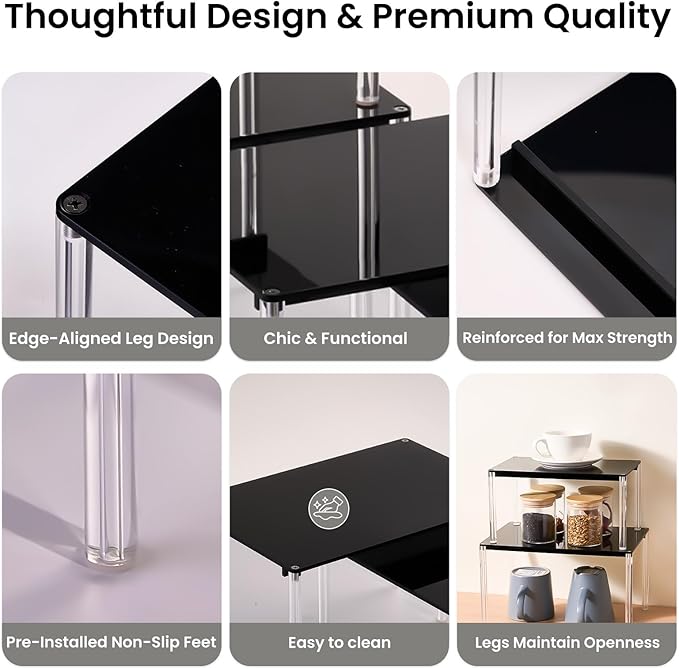 - Detailed & Safe by Design | Smooth & Non-Slip We focus on the details that matter. Every edge of this acrylic shelf riser is finely polished to be smooth and safe to the touch. For your convenience and to protect your surfaces, each leg comes with a pre-installed non-slip pad. This thoughtful feature saves you time and prevents scratches on your delicate countertops, whether it's a wooden desk or a bathroom vanity shelf, ensuring your furniture stays protected