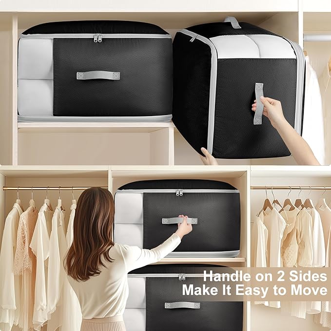 - [Dual Reinforced Handles for Easy Access] Equipped with two strategically placed handles—one on the front and one on the side—our blanket storage bag allows you to easily pull it out whether it's stored horizontally or vertically. The reinforced stitching of the whole bag ensures sturdy support, making it effortless to move or reorganize even when the comforter storage bag is fully packed