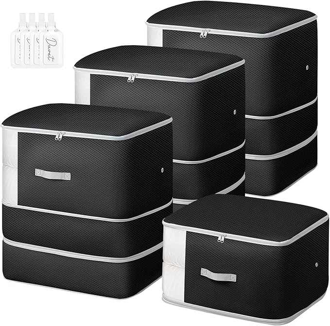 Comforter Storage Bag - 130L Large Capacity Blanket Storage Bags 3-Layer Ultra Space Saving Self Compression Organizer, Washable Compression Bags for Storage Comforter Blanket, 4-Pack, Black