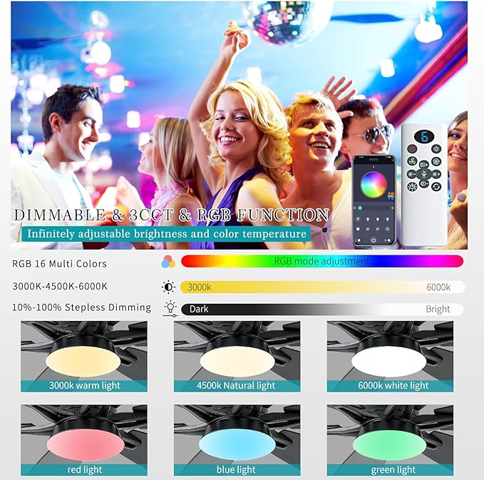- 【RGB & Dimmable LED Lighting】: Equipped with an innovative 4-mode lighting system, it supportsfree switching between warm white (3000K), natural white (4500k), cool white (6000K), and RGB colorlights, catering to diverse needs such as daily lighting and atmosphere creation. Both the lighting andfan can be controlled independently or synchronously, with brightness supporting steplessadiustment from 5% to 100%. Whether for reading, dining, or gathering occasions, it can preciselymatch lighting needs and easily create an ideal home atmosphere.
