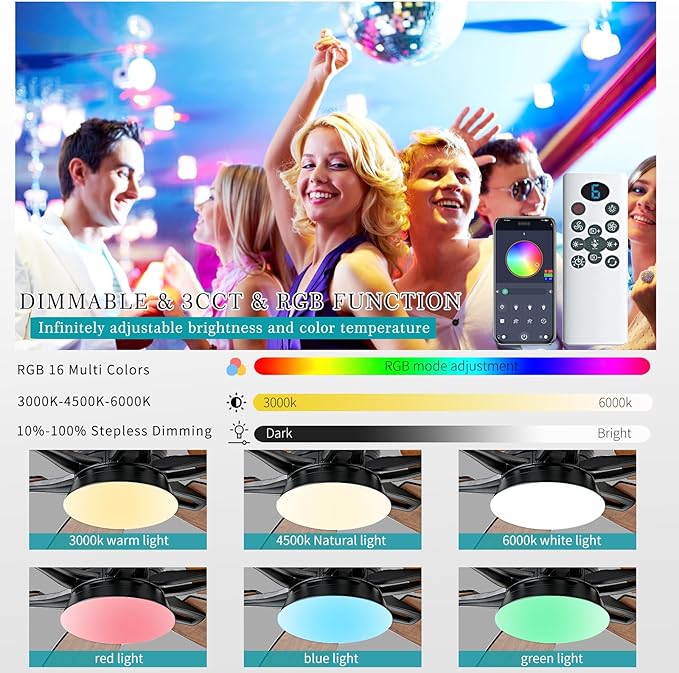 - 【RGB & Dimmable LED Lighting】: Equipped with an innovative 4-mode lighting system, it supportsfree switching between warm white (3000K), natural white (4500k), cool white (6000K), and RGB colorlights, catering to diverse needs such as daily lighting and atmosphere creation. Both the lighting andfan can be controlled independently or synchronously, with brightness supporting steplessadiustment from 5% to 100%. Whether for reading, dining, or gathering occasions, it can preciselymatch lighting needs and easily create an ideal home atmosphere.