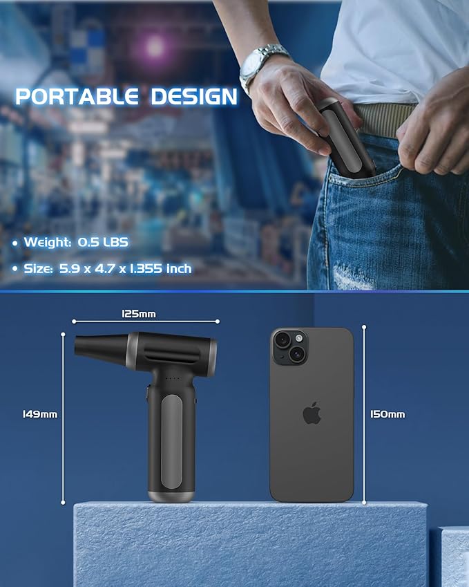 - Mini air dusters【carry in pocket 】--As turbo fan use, only have【1.35*5.9 Inch, 0.5lb】 air duster replace compressed air can. Fits in your pocket without any stress! And mini blower adopts human engineering design. Feel more comfortable, easy to use, anytime, anywhere.