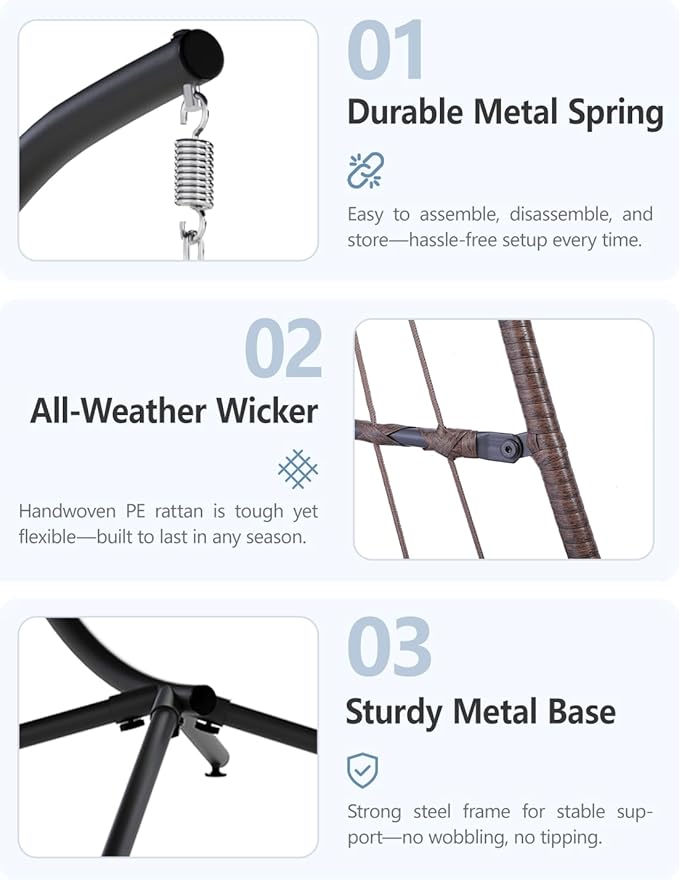 - Heavy-Duty & Rust-Resistant Build: Made with a powder-coated steel frame and hand-woven all-weather wicker, our hanging egg chair supports 350 lbs and resists rust, fading, and wear better than most outdoor egg chairs