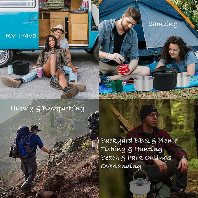 - [ Flexible Usage ] : This set designed can be used both indoors and outdoors .It can be used on gas stoves and heating elements .This set is ideal for backpacking ,family car camping trips,in the RV touring and picnics.