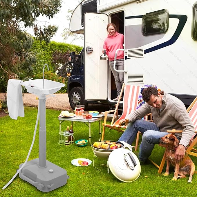 - 18L Large Capacity, Hygienic Design- Stainless steel faucet + soap dispenser + towel rack. Outdoor sink station keeps hands & dishes clean—ideal for camping, RVs, job sites & more.