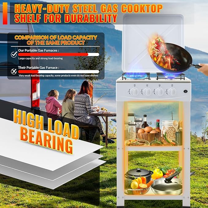 - 【Gas Stove Dimensions】 - This white gas stove measures 19.2"L x 17.4"W x 7.1"H, with sturdy legs standing at 28.2"H. Designed with four burners, it provides a stable surface for pots and pans. Plus, the built-in placement board offers convenient storage for fruits, vegetables, and other essentials. Gather your friends and family to cook together and enjoy a delicious feast.