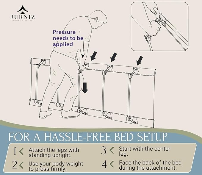 - đ¤ AN INCREDIBLE NIGHTâS SLEEP OUTDOORS: After a long, hard day of hiking through thick woods, conquering steep mountains and rugged terrains, you need and deserve a super comfortable nightâs rest. The JURNIZ camping cot awaits, ready to transport you to dreamy sleep so youâre refreshed and energetic for tomorrowâs adventures.