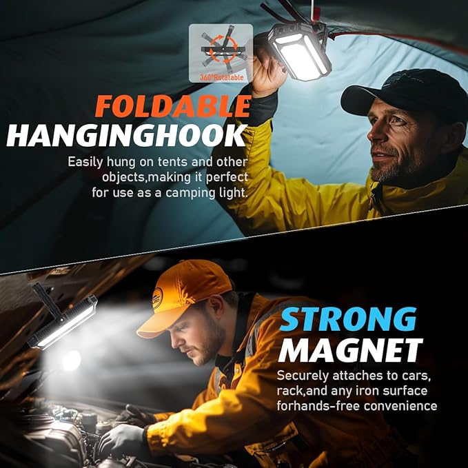 - 360° Hook & Strong Magnetic Base - The 360° hook design allows the camping lantern to be hang on objects such as tents. Our rechargeable camping lights comes with Built-in strong magnet, which make it can be firm stay on car, track or any other metal surface for use as working lights.