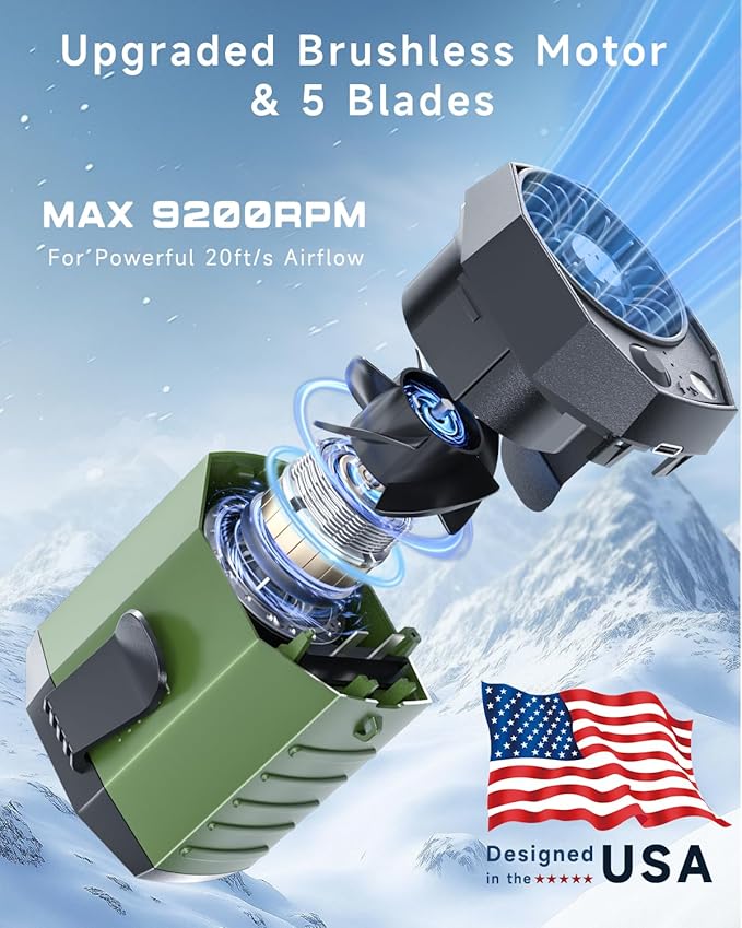 - 【4 Adjustable Speeds, Powerful Airflow】 This portable clip on fan offers 4 speed settings, from a gentle breeze to a strong gust, suitable for various environments. With an upgraded high-speed brushless motor and 5-blade turbo fan reaching 9200 RPM, it quickly cools your body. (Speeds 1-2 for quiet indoor use, speeds 3-4 for noisy outdoor use.)