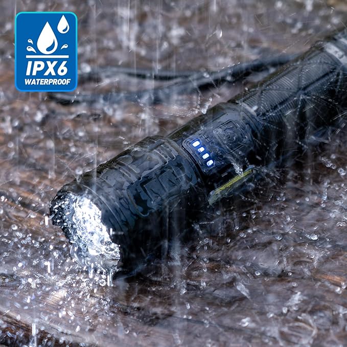 - 🔦[IPX6 WATERPROOF & HIGH-QUALITY MATERIALS] - The high lumen flashlight is highly waterproof and can be used properly in wet environments. And it is made of military-grade aluminum alloy material, which is drop and wear resistant.