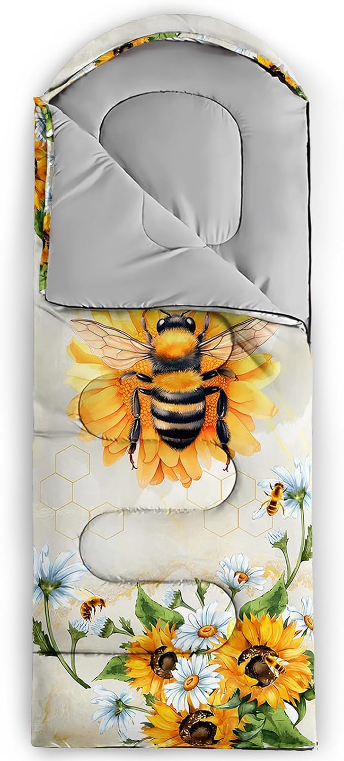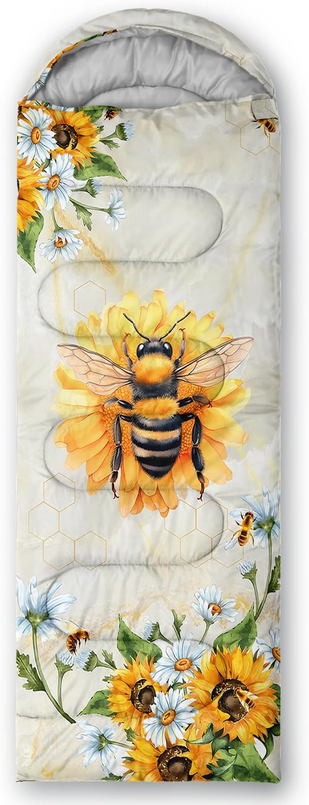 - Unique Bee Design:This Bee pattern sleeping bag is made of 3D digital printing with vibrant colors and patterns,size: 31W x 90L inches,temperature range: 32℉-77℉ (0℃-25℃),it also also have a weather resistant waterproof design to keep you warm and prevent you from any dampness,can be used in 3 seasons