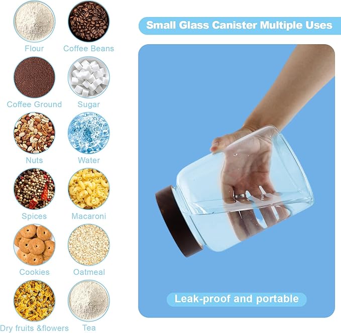 - 【WIDE APPLICATIONS】 Glass kitchen canisters for pantry organization and storage are suitable for storing various dried ingredients to retain their freshness, with clear glass jars, you can easily see inside and quickly find the ingredients you need.Glass jars with wood lids perfect for storing dry food , such as,cookies,dried beans,pepper,oatmeal,jams,chutneys, rice, flour, tea, coffee, biscuits, candy,cheese,flour, sugar, seeds,etc. Keep your kitchen tidy and safe,saving space and convenient .