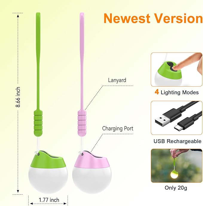 LETMY Rechargeable Camping Lights, 2 Pack Portable tent lights With 4 Lighting Modes, 150LM LED Camping Lantern, Only 20g Hanging Tent Lantern With Silicone Lanyard for Kids Hiking Backpacking Outages