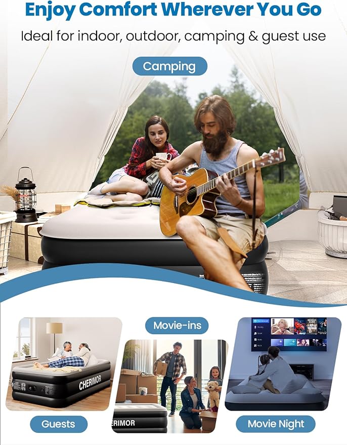 - Luxury Pillow-Top Design for Hotel-Like Comfort: The sleek, grooved top mimics the look and feel of a premium pillow-top mattress. Made with 0.2mm ultra-soft flocked fabric and 0.4mm puncture-resistant PVC, this full air mattress with built in pump provides skin-friendly comfort and exceptional durability—even with daily use