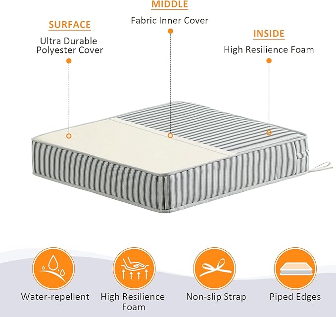 - 【Non-slip Ties and Piped Edge】 The two non-slip ties can be fastened to your furniture to keep the outdoor cushion in place. Some seams are finished with piping, which reinforces the edges and makes the outdoor furniture cushion more stylish.