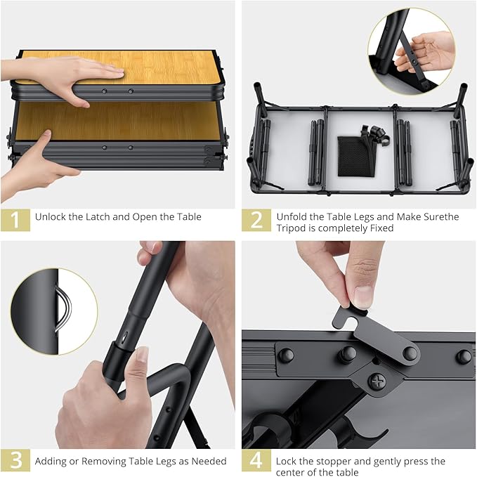 - High Quality Material for Security and Stability: The entire frame of the portable camping table is made of thicker aluminum alloy, which is very solid and durable. MDF (Medium Density Fiberboard) tabletop is smooth and easy to clean. After the used table top is left with water or oil stains, you can easily remove the stains by just rubbing with a wet paper towel
