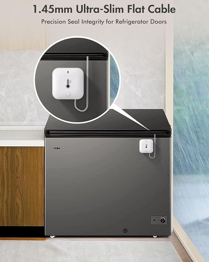 - High-Precision Temperature Sensor -Remote freezer thermometer has a measurement range of -40°F to 221°F, built-in industrial-grade temperature chip, accuracy of ±0.9°F, 2-second fast refresh to ensure reliable data. Ultra-thin 1.45mm cable fits any fridge door seal