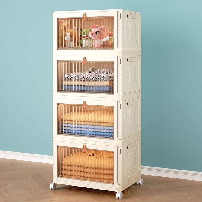 - Stackable & Removable - The storage organizer bins are stackable and mobility. Each layer has matching grooves and clasps on both sides of the top to securely lock the clear storage bins. There are four rotating wheels at the bottom, which makes it easy for you to move. In addition, 2 wheels of the storage shelves have clasps that hold the locker in place to prevent it from moving