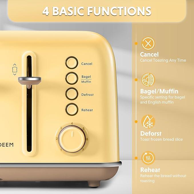 BUYDEEM DT640 Retro 4 Slice Toaster, 7 Shade Settings, Extra Wide 1.5'' Slots, Stainless Steel Toaster with Bagel Muffin Defrost Reheat Function, Yellow