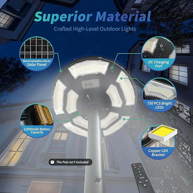Outdoor Lamp Post Light with Motion Sensor, Solar Powered, IP65 Waterproof, Dusk to Dawn, 750-LED Pole Light Fixture with Remote and DC Port for Indoor Outdoor Lighting(Includes Plug)
