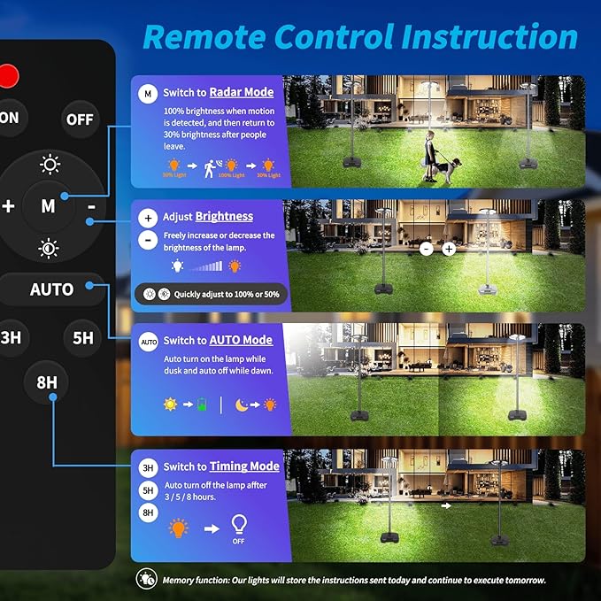 - Multiple Lighting Modes: This outdoor street lamp offers three versatile lighting modes: radar sensor, dusk-to-dawn, timed lighting, and continuous illumination. When motion is detected, the radar sensor mode adjusts to 100% brightness and switches to 30% when no motion is detected. In dusk-to-dawn mode, the lamp automatically turns on at dusk and off at dawn. It also features adjustable brightness levels, and the timed mode provides preset illumination durations (3H/5H/8H) via remote control. The lamp will automatically turn off once the set time expires