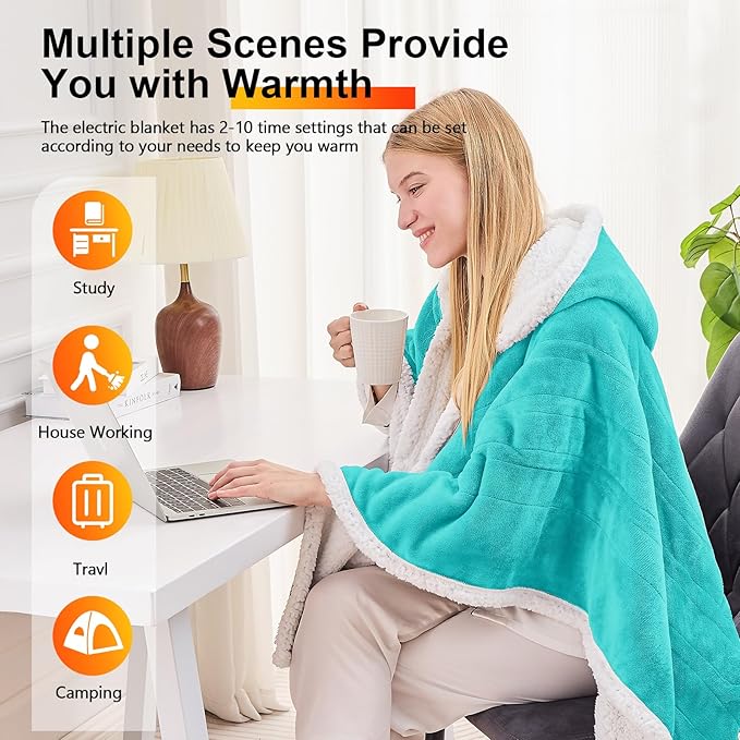 - Embrace Warmth and Comfort-This electric wearable blanket hoodie gives you double the warmth with its soft double-sided design. One side is skin-friendly flannel,the other side is warm Sherpa fabric, ensuring you stay warm even in the cold office chair. Careful stitching makes every seam strong and durable, and it will stand the test of time. What's more, it's machine washable and uses advanced dyeing technology, so you don't have to worry about the color fading. Easy care, long-lasting like new