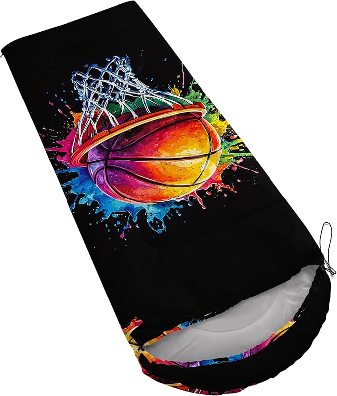 - Unique Basketball Design:This Basketball pattern sleeping bag is made of 3D digital printing with vibrant colors and patterns,size: 31W x 90L inches,temperature range: 32℉-77℉ (0℃-25℃),it also also have a weather resistant waterproof design to keep you warm and prevent you from any dampness,can be used in 3 seasons