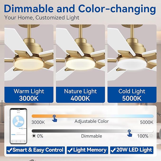 - 【75% Energy Save & 2 Colors Blade】This ceiling fan features a double-sided design and is available in gold white and gold black colors, providing you with more options for matching your room. Compared with traditional AC motors, our smart ceiling fan with light uses an energy-saving DC motor that can save up to 75% of energy and reduce your electricity bill.