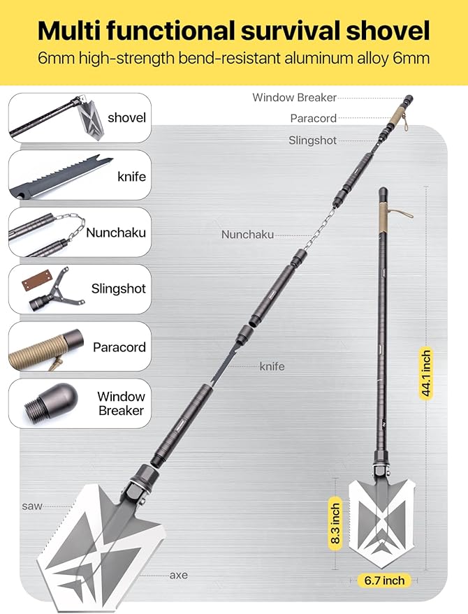 - 【Hidden Self-Defense & Hunting Tools】- The shovel handle secretly stores a detachable slingshot and nunchaku, offering extra versatility for outdoor hunting and self-defense. It’s both practical and discreet, adding more value to your exploration and safety.