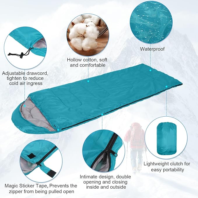 - Suitable for 4 Seasons: this lightweight sleeping bag is suitable for using all year round and has a weatherproof design that resists moisture and keeps you warm even in extreme weather; With this sleeping bag, you can get deep sleep after camping or hiking