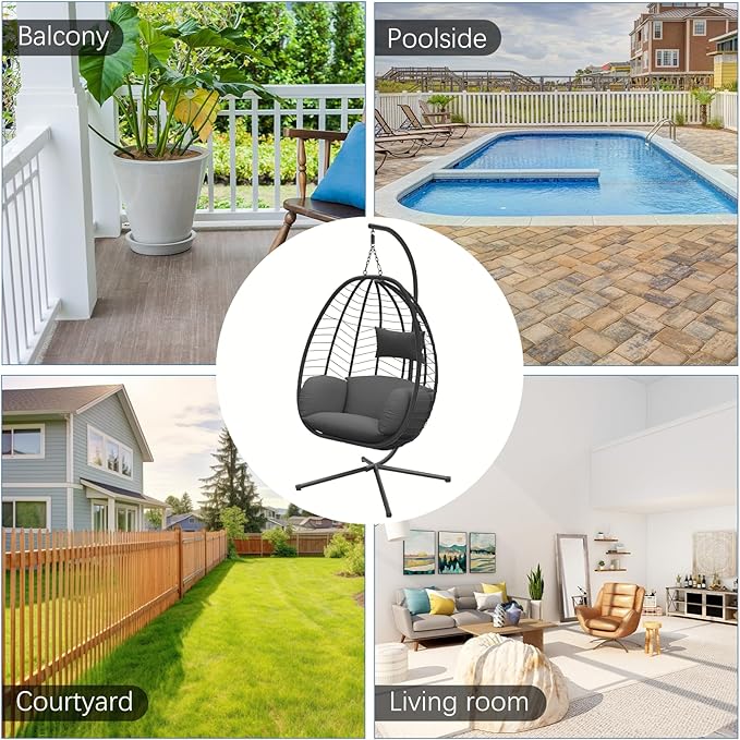 - 【Sturdy and Durable】: Foldable egg swing chair with stand is made of weatherproof PE wicker and supported by thickened steel tubes that can hold up to 350 lbs! The tubes are coated with anti-rust paint, so you can use it outside