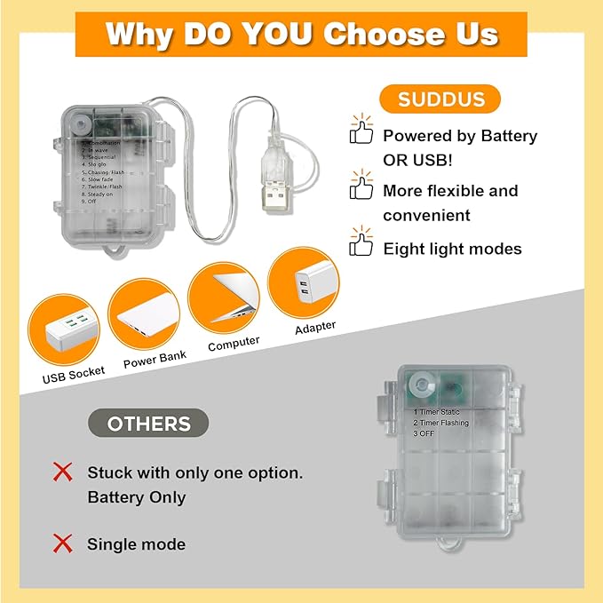 - [DUAL POWER FREEDOM: USB + BATTERY]:No outlets by the nursery corner? Hosting outdoor parties? Our versatile fairy lights solve it all with a 2-in-1 power system. Plug into USB for a continuous glow or use batteries (3xAA not included) for a completely cordless setup. Now you can decorate gardens, weddings, or balcony cafes without limitations—unlike restrictive single-power fairy string lights.