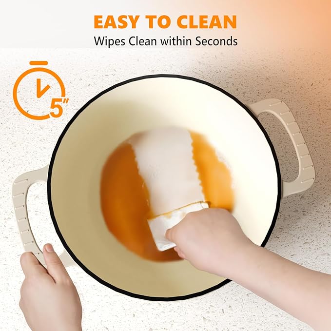 - Easy Cleanup & Added Convenience:The smooth enamel surface resists stains and wipes clean effortlessly with a sponge—no scrubbing needed! Included heat-resistant pads protect your hands when handling hot lids or lifting the pot. Practical and stylish, it’s as easy to maintain as it is to cook with