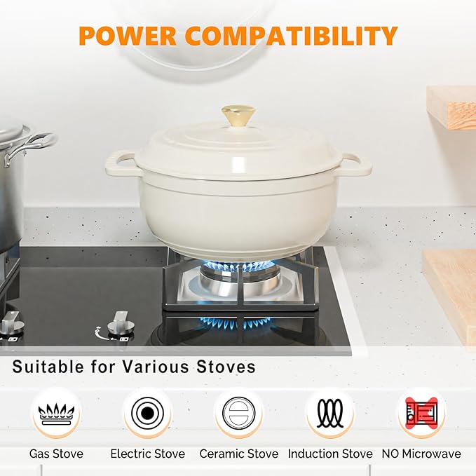 - Universal Compatibility for Any Kitchen:Designed for versatility, this cast iron dutch oven works seamlessly on gas, electric, induction, and ceramic stovetops. Oven-safe up to 500°F, it transitions effortlessly from stovetop searing to oven roasting. Whether you’re frying, boiling, or baking sourdough, it delivers consistent heat for flawless cooking