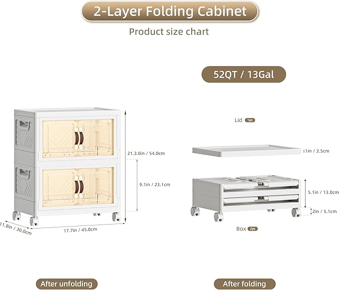 52 QT / 13 Gal Stackable Storage Bins with 1 Lid, Collapsible Plastic Organizer Cabinet with Wheels & Magnetic Doors for Closet, Home, Office – White Containers