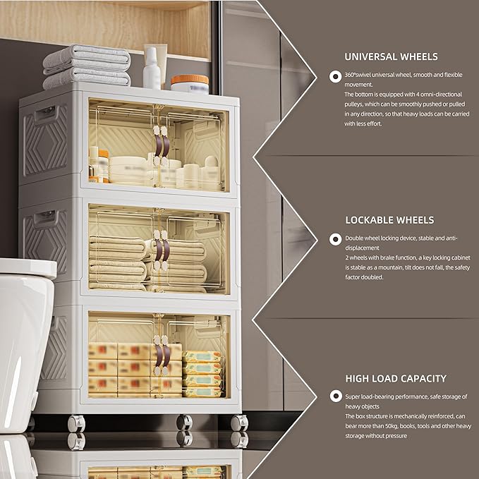 200 QT / 50 Gal White Storage Bins with 1 Lid - Collapsible Stackable Cabinet Organizer w/Wheels & Magnetic Doors, Plastic Storage Box for Office Closet Organization