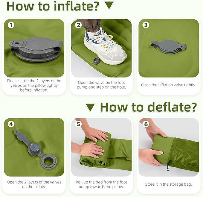 - 【Only 30s Step to Inflate & 1s Deflate】 Including an innovative built-in foot pump- Just pedal 30-60s to fully inflate the camping mat, which is convenient and easy, no longer need to inflate with your mouth, hands or carry a pump, and it only takes 1 second to quickly deflate. With the upgraded version of the air release valve with no leaking film, you shall never worry about air leaking!