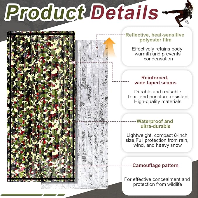 - Quality and Durability: hiking supplies are made of thick, tear and puncture resistant PE material, the interior retains/ reflects 90% of body heat and body temperature; With reinforced wide tape joints to meet the needs of long term use, providing you with reliable protection in emergency situations