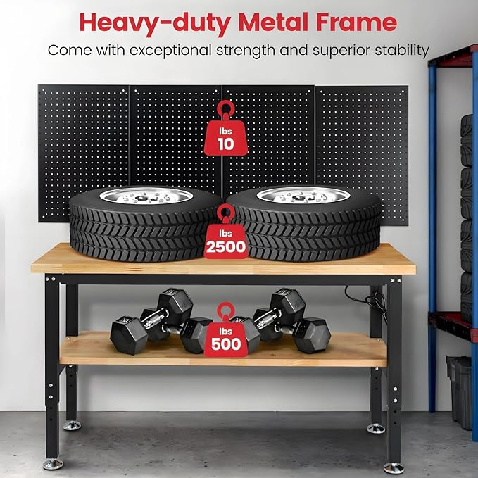 60 Inch Work Bench for Garage Adjustable Height Workbenches with Under Table Shelf Pegboard Pad Power Outlets Work Table for Woodworking, Home, Office, Workshop