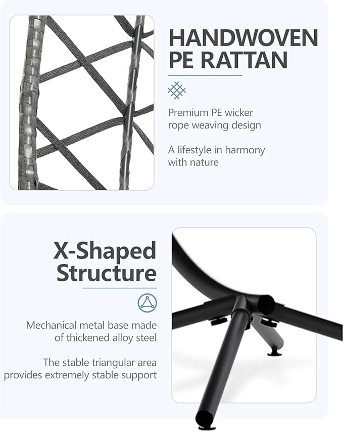 - ★ Comfort You Can Sink Into: Experience the ultimate relaxation in the egg swing chair with stand. With cloud-like cushions, a padded headrest, and a roomy, ergonomic seat, this hanging egg chair cradles your body for all-day comfort. Whether you’re on the porch or in the living room, it’s your new favorite spot.