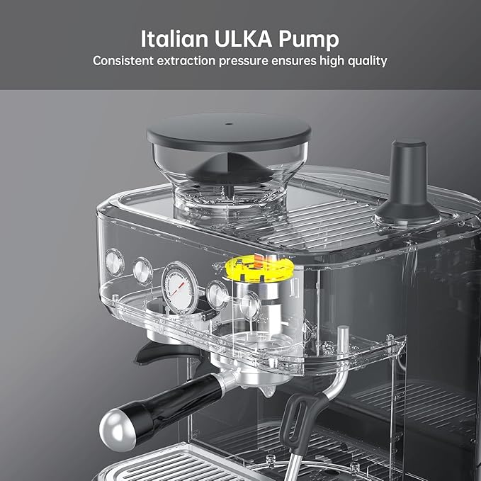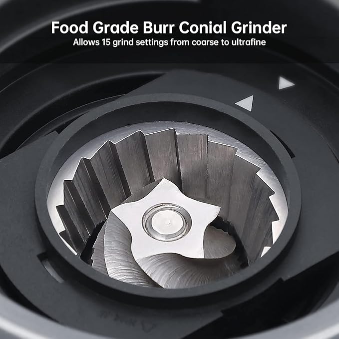 - 【Professional Espresso Machine with Grinder】This espresso machine with grinder features a food-grade stainless steel conical burr blade (better than flat blades) for even grinding, reducing flavor oxidation. It has a 250g bean compartment and 15 adjustable grinding levels, adapting to needs from delicate espresso to coarse press pots. Enjoy "one cup, one grind" freshness, replicating pro coffee shop flavor at home.
