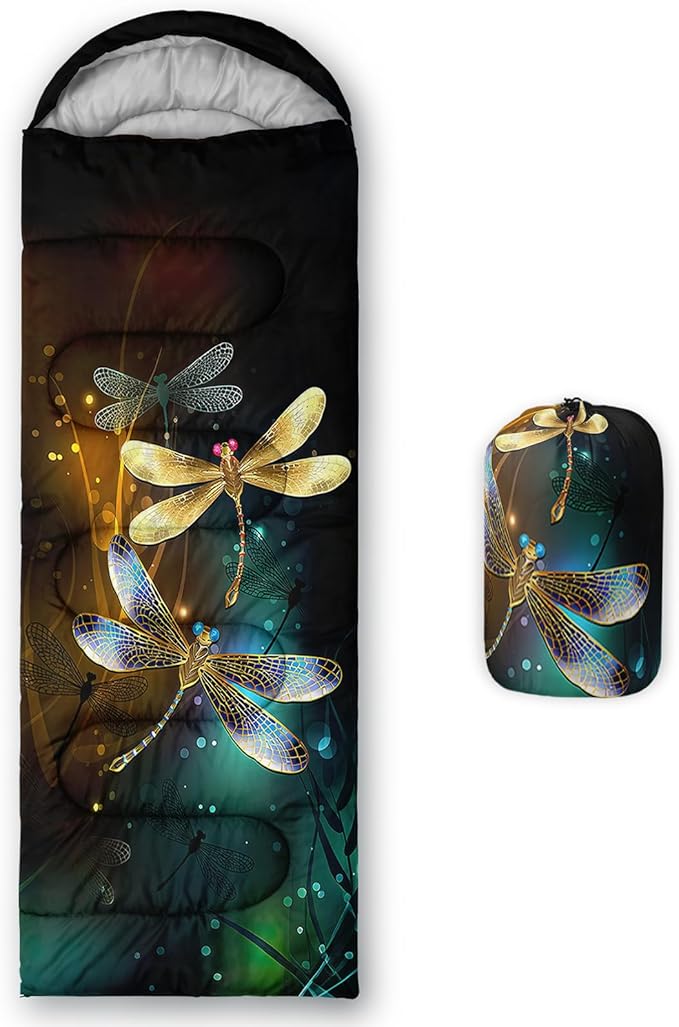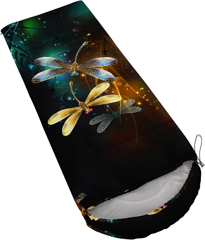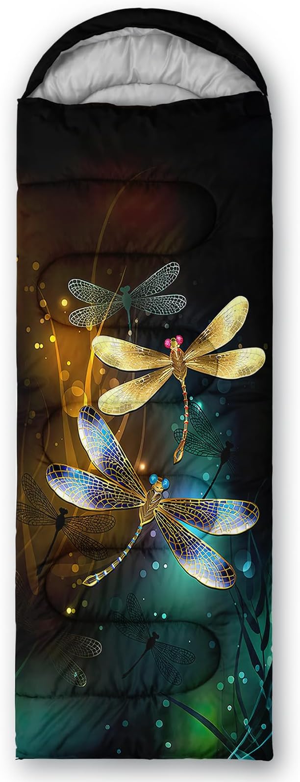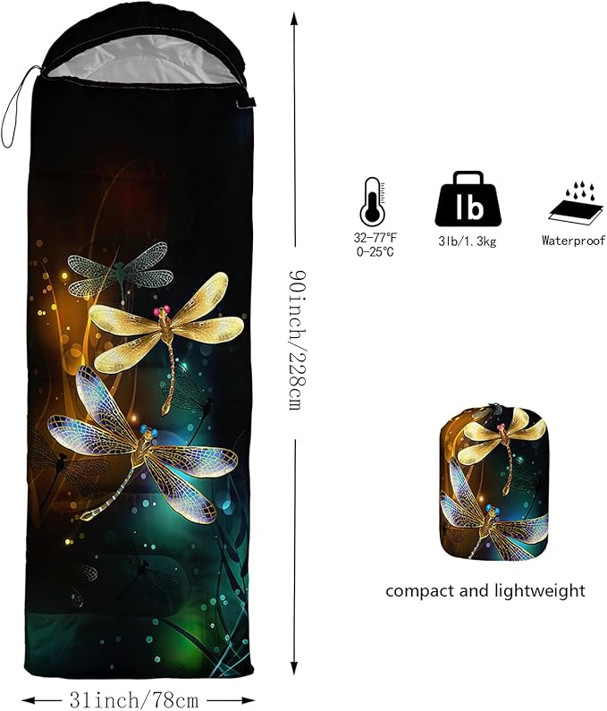 - Unique Dragonfly Design:This Dragonfly pattern sleeping bag is made of 3D digital printing with vibrant colors and patterns,size: 31W x 90L inches,temperature range: 32℉-77℉ (0℃-25℃),it also also have a weather resistant waterproof design to keep you warm and prevent you from any dampness,can be used in 3 seasons
