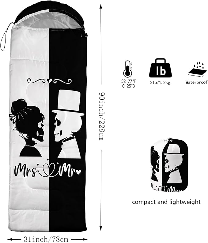 - Unique Skull Design:This Skull pattern sleeping bag is made of 3D digital printing with vibrant colors and patterns,size: 31W x 90L inches,temperature range: 32℉-77℉ (0℃-25℃),it also also have a weather resistant waterproof design to keep you warm and prevent you from any dampness,can be used in 3 seasons