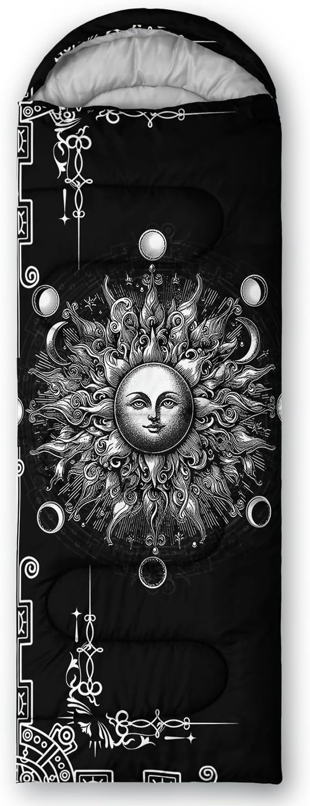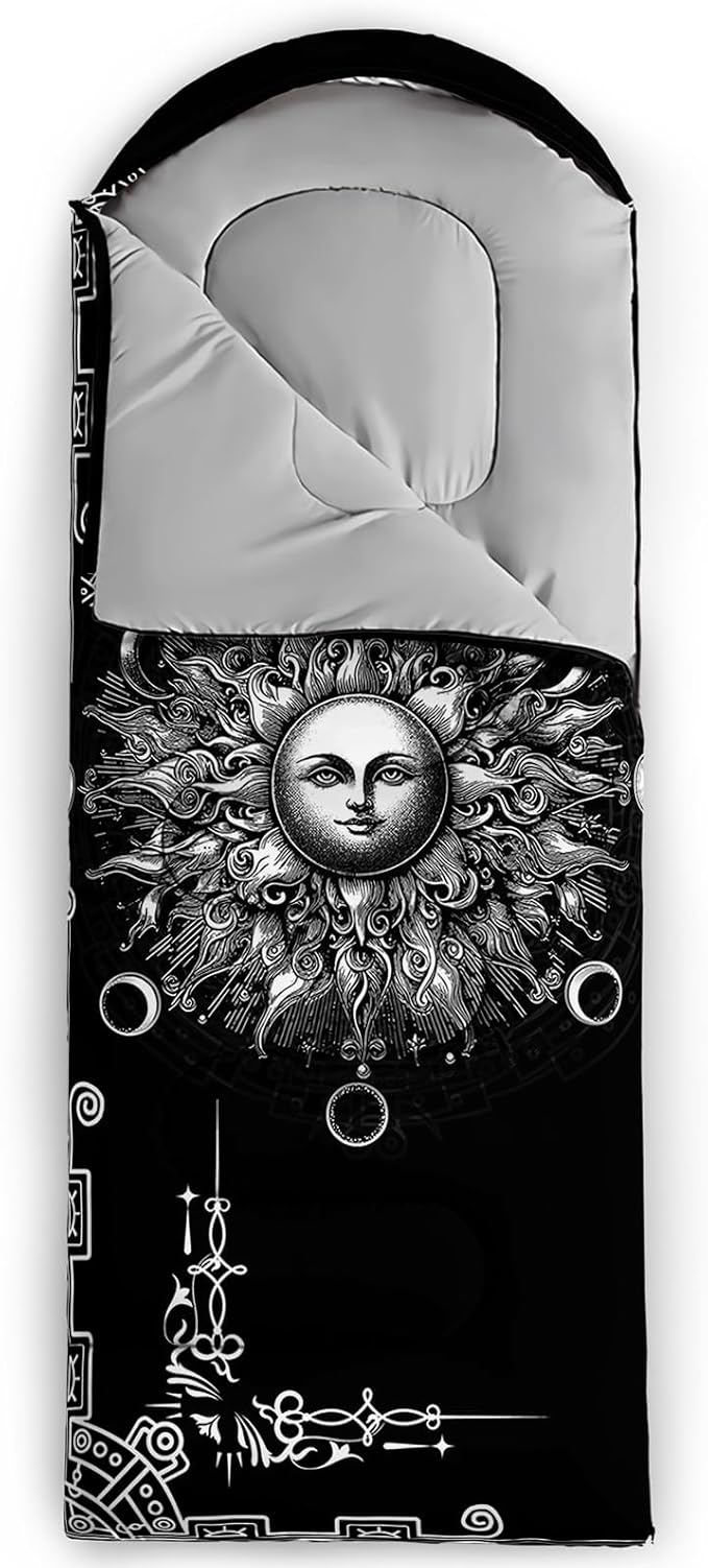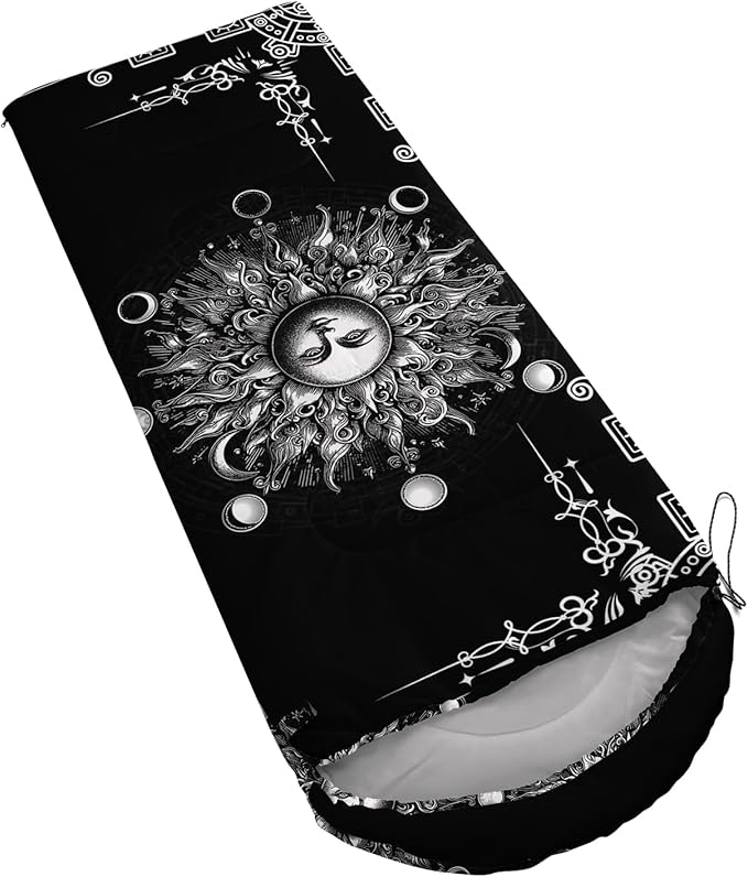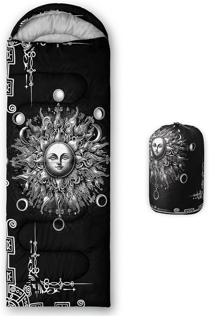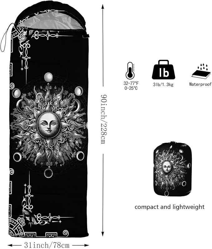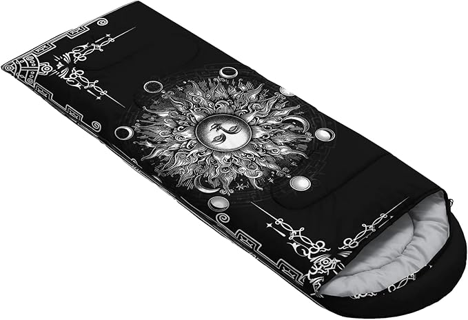- Unique Sun and Moon Design:This Sun and Moon pattern sleeping bag is made of 3D digital printing with vibrant colors and patterns,size: 31W x 90L inches,temperature range: 32℉-77℉ (0℃-25℃),it also also have a weather resistant waterproof design to keep you warm and prevent you from any dampness,can be used in 3 seasons